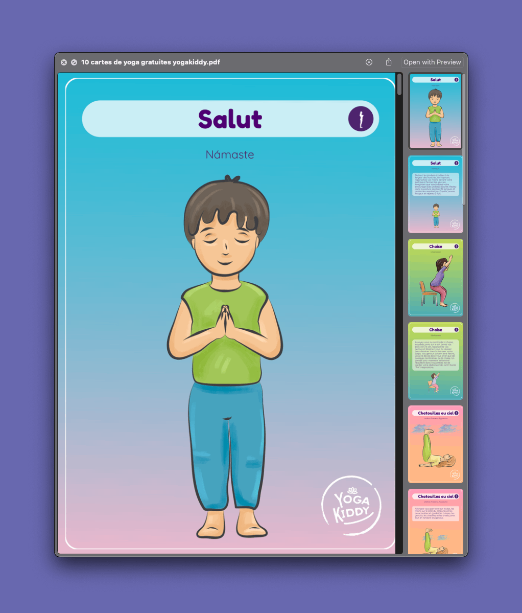 30 cartes illustrées de Pandi Yogi, conçues pour animer vos séances de yoga pour enfants.